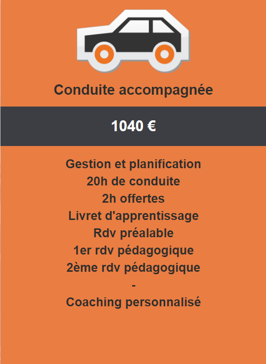 La conduite accompagnée est accessible dès l'age de 15 ans. Elle permet la conduite d'un véhicule de la catégorie B en présence d'un accompagnateur.